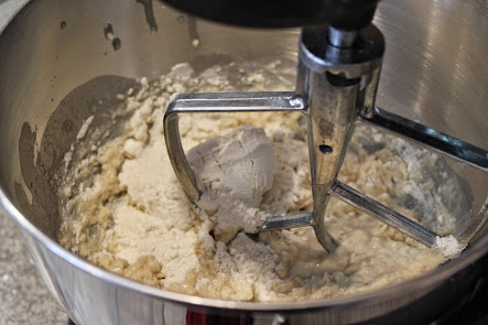 Using the flat beater, add flour 1/2 cup at a time, mixing